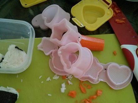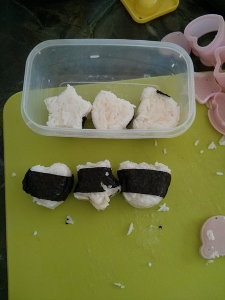 ג. מילוי : אני שמה לתוך כל צורה מפלסטיק רצועת אצה, אורז, מילוי ואז עוד אורז.
