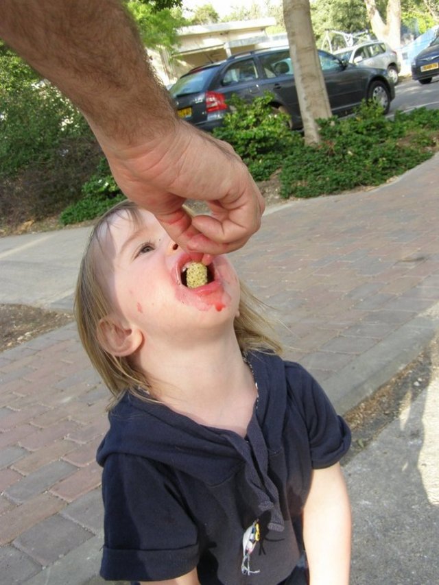 היום לא עמדנו בפיטוי וטעמנו פרי אחד. הפרי בערך בגודל של עגבניית שרי, עם גרעינים בדומה לפיטנגו. במאמץ מה, חילקנו אותו לשלושה חלקים (אורן, אני ובעלי).