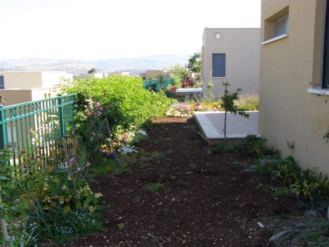 צילום הגינה האחורית עם הגדר פסיפלורה מצד שמאל: