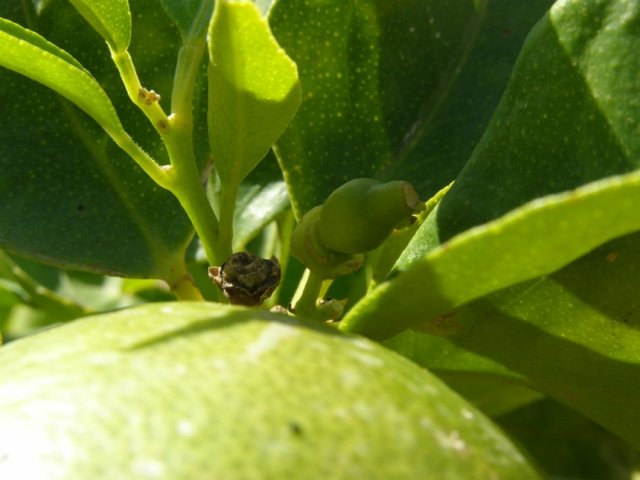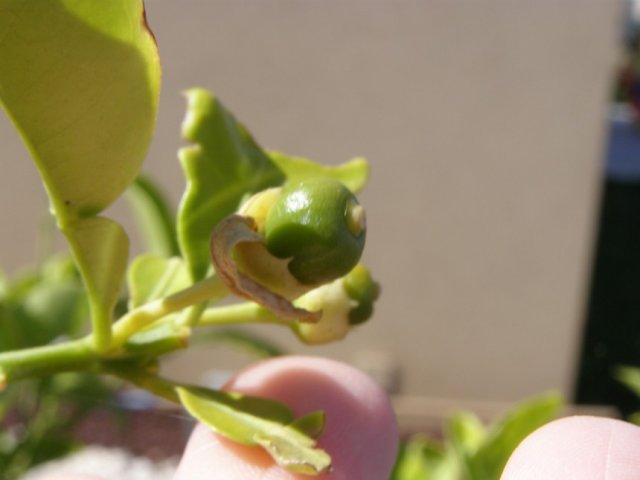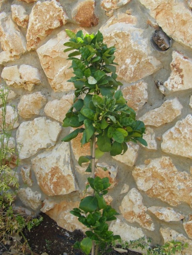 פירות ראשונים, עץ ששתול פחות משנה. הוא כרגע בעיקר מקל עם קצת עלים. מעניין אם הוא יצליח לשאת את משקל הפרי או שיפיל אותו. כרגע הצוציק הזה מחזיק עליו קרוב ל שבע פירות.