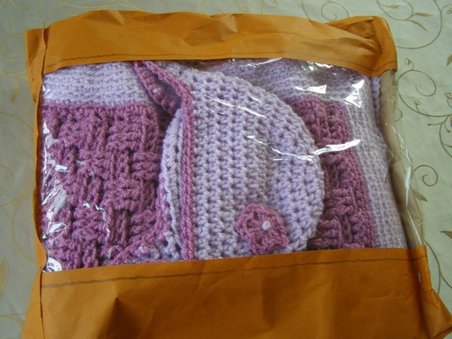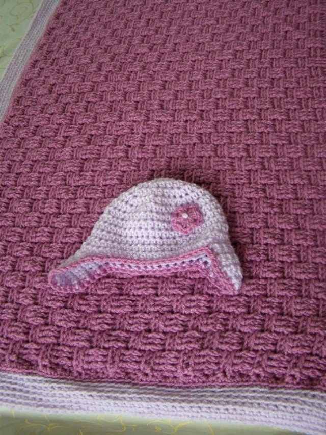 שמיכה וכובע שנסרגו כמתנת לידה לבת דודה 🙂