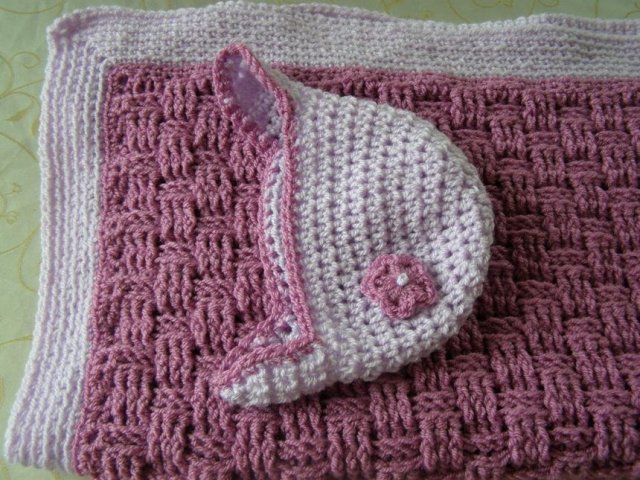 שמיכה וכובע שנסרגו כמתנת לידה לבת דודה 🙂