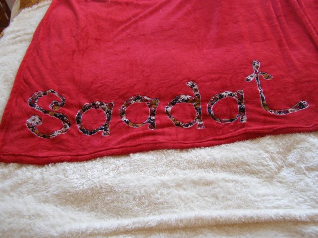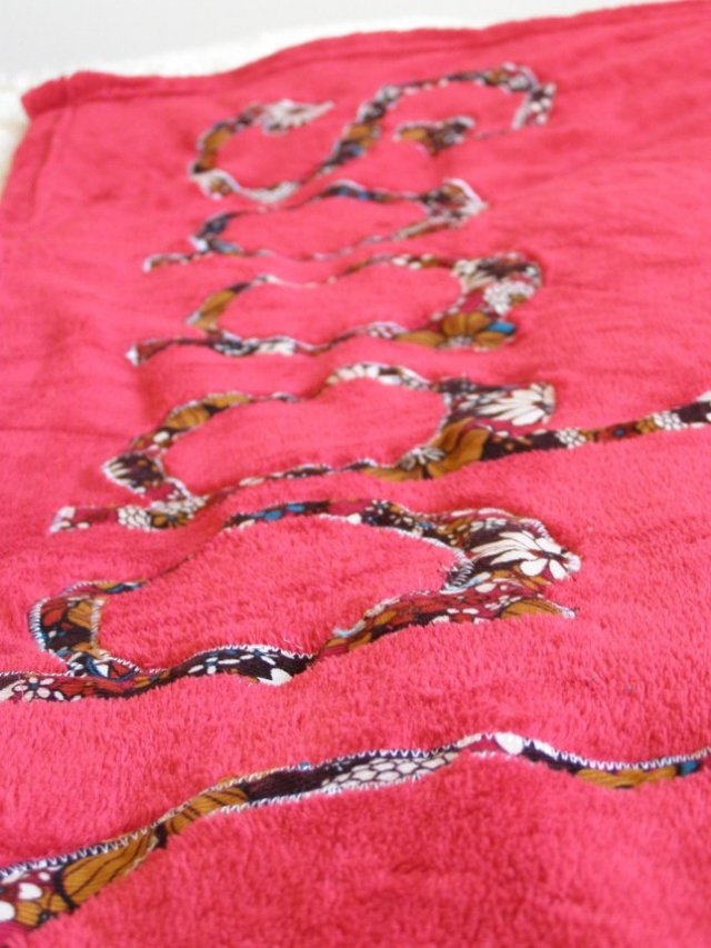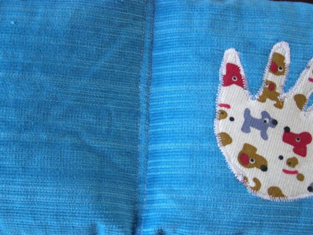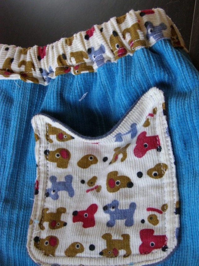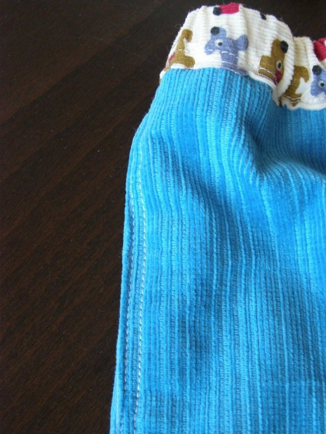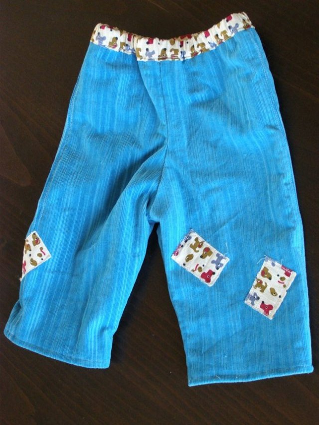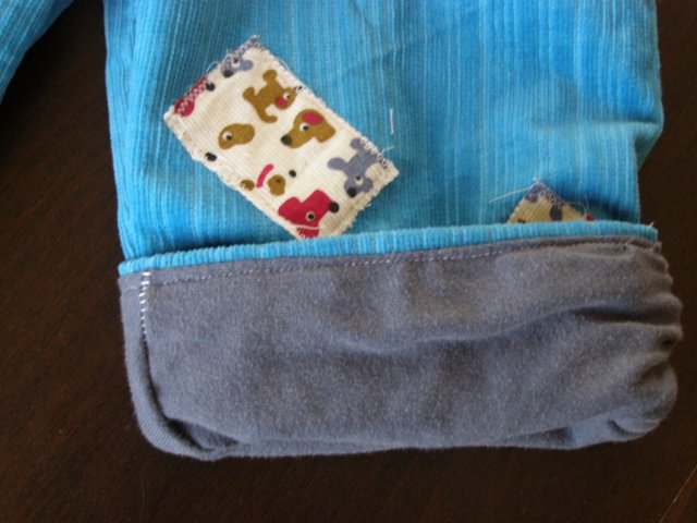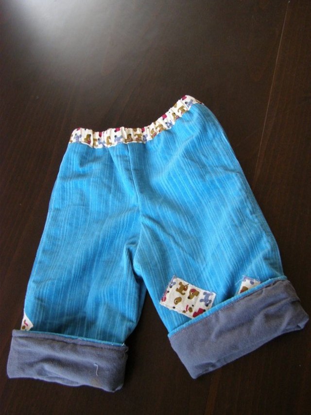 במקור פשוט תפרתי לשונית כי חשבתי שהוא ילבש אותו עם הירוק כלפי חוץ, אבל אחרי שסיימתי, אהבתי דווקא את השילוב השני אז כדי שלא תהיה לו לשונית שבולטת החוצה, תפרתי אותה מטה אל המכנס. את האמת, יצא טוב. תוהה אם כדאי לקנות סרטים עם הדפסים כדי לעשות לשוניות תפורות כאלו גם למכנסיים אחרים שלו.