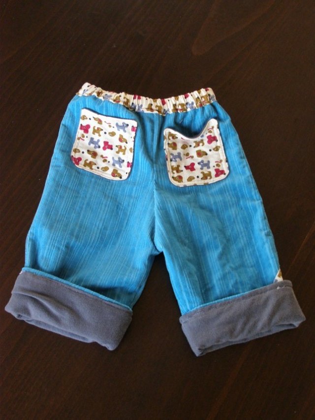 אז החלטתי לנסות לתפור לו מכנסי פליז דו שכבתיים. הרוח עדיין חודרת, אבל פחות והם תענוג למגע.