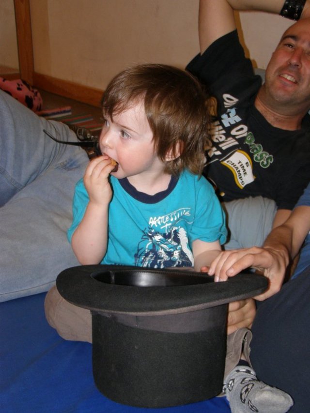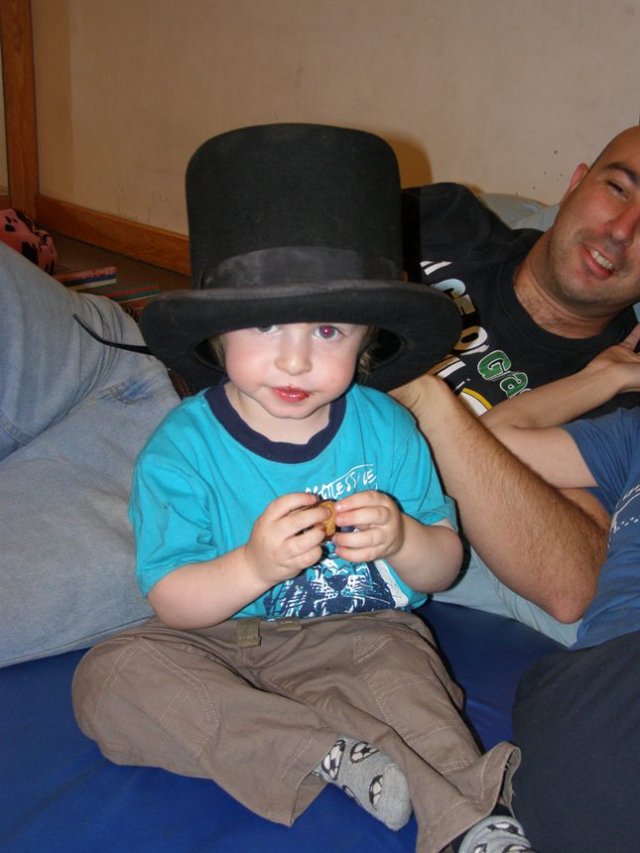 מנסים לשחד את אורן עם עוגיה כדי שיסכים ללבוש את הכובע:
