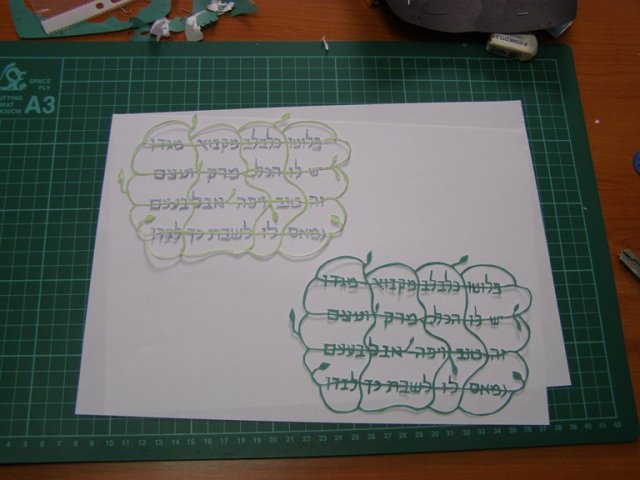 לא חתכתי שום דבר שלו אבל אני אוהבת להסתכל על העבודות שלו בשביל השראה. השתמשתי ברעיון המילים התלויות שלו כדי לחתוך את זה: